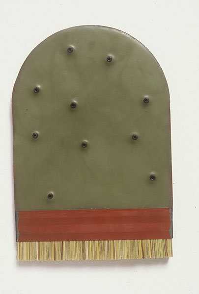 This indoor floor sculpture is composed of plaster and steel.