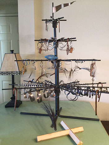 The Tree is composed of hand turned seamless steel bars. Over the years it has been decorated with small sculptures, toys, photos and lights.