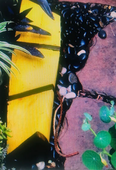 This sculpture was created using natural found materials. The bag of concrete and the wood were discards from a building project.