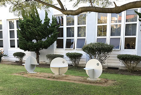 The 1,2, and 3 Seat Sculpture is installed at The Santa Monica College Performing Arts Center in Santa Monica.. It is in the Arts Center’s park at 11th and Arizona Streets.